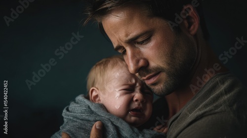 Father comforting crying baby home emotional portrait indoor close-up love and support