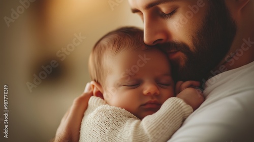 Father gently holding a sleeping baby in a tender moment of bonding and love