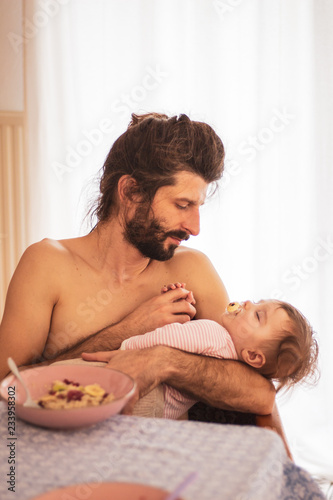 father having breakfast while baby sleeps in his arms