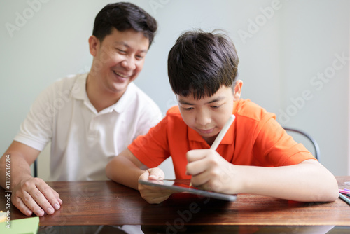 Father helping his son doing homework and drawing on tablet with happiness family moment at home