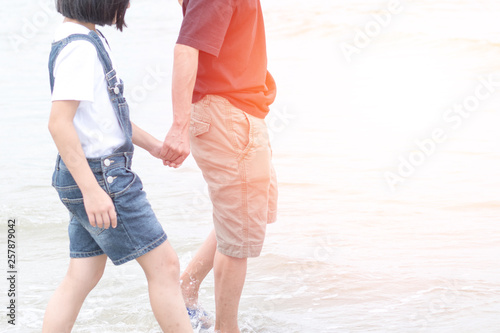 Father holding hand daughter walking on beach during vacation