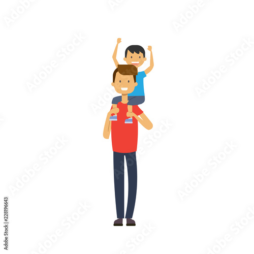 father holds his son on back over white background, happy family concept, flat cartoon design vector illustration