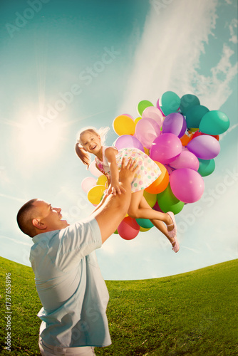 Father lifting little daughter with colorful balloons into the sky on a sunny day. Concept of childhood joy, family bonding, happiness, freedom and celebration outdoors in bright summer atmosphere.