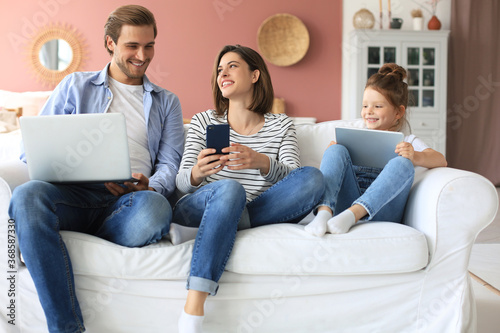 Father, mother and daughter using electronic devices sitting on sofa at living room.