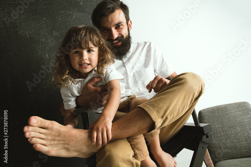 Father playing with young son in their sitting room at home. Young dad having fun with his children in holidays or weekend. Concept of parenthood, childhood, father's day and family relationship.