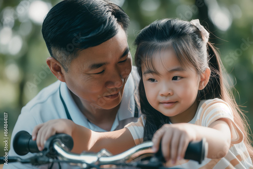 Father Teaches Young Daughter How to Ride a Bicycle in a Sunny Park