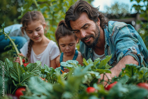 Father Teaching Daughters Organic Farming in Vegetable Garden