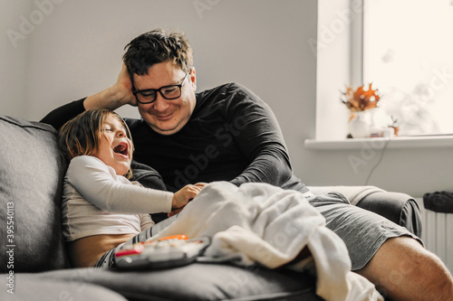 Father with child on the couch. Cozy home activity with child. fatherhood