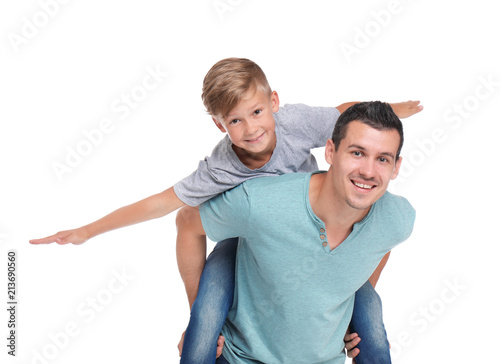 Father with child on white background. Happy family