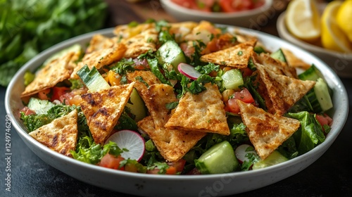 Fattoush salad lettuce cucumber tomatoes radish and crispy pita chips served with lemon dressing isolated on a white plate a light Lebanese lunch