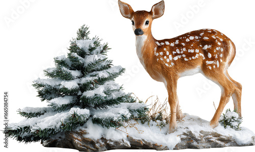 Fawn in the snow, forest, Christmas tree figurine isolated