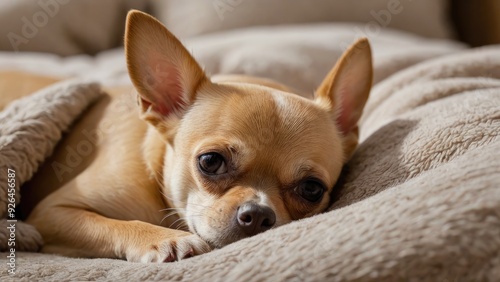 Fawn smooth coat chihuahua dog lying on bed in the bedroom