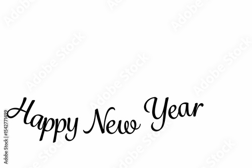 Featuring black cursive Happy New Year text arcing across minimal flat design white canvas