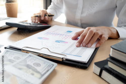 Fee and Tax concept, Male Business auditor using calculator in the cafe.