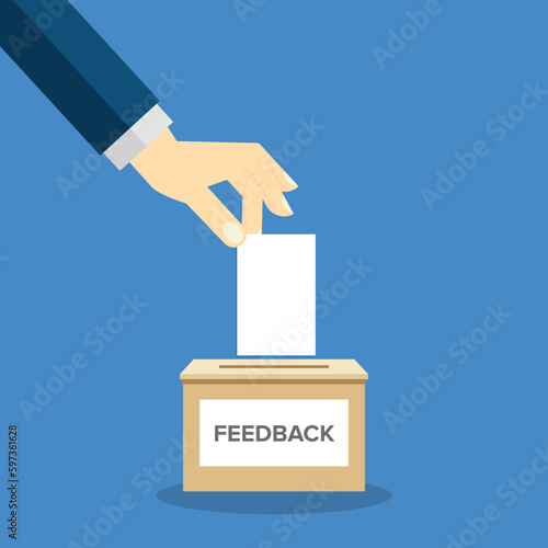 Feedback, feedback box. Hand holding feedback paper card and. Customer suggestion. Submission of comment, feedback, suggestion in box. Customers review concept.
