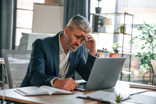Feeling bad, tired, having headache, stressful. Senior businessman is working in the office