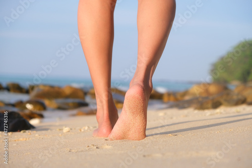 Feet and legs of women walking on Beach of the sea On weekends