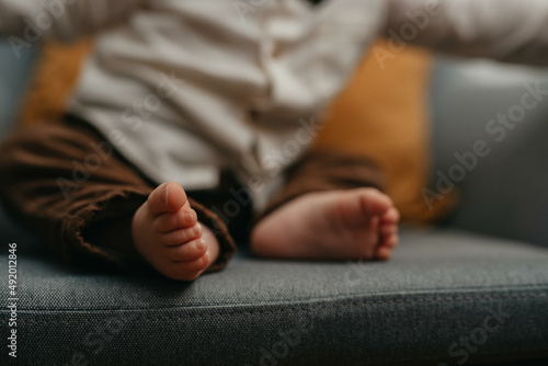 Feet of a baby in the hands of parents. Happy Family concept. Mum and Dad hug their baby's legs.
