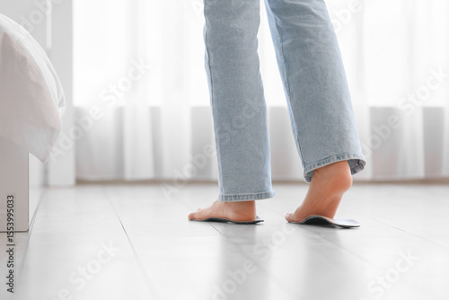 Feet of woman with orthopedic insoles in bedroom, back view