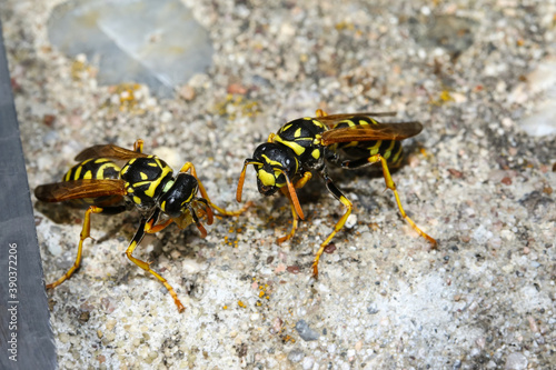 Feldwespen vor ihrem Bau in einer Metallröhre, Polistes bischoffi