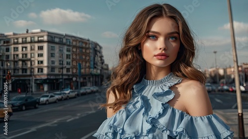 Female, 25 years old, beautiful, wavy semi-long hair, hair, Blue eyes 、frill short dress, cell animation style