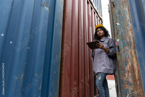 Female African American smiling engineering in uniform wear hard hat standing containers yard holding tablet. Area logistics import export and shipping.
