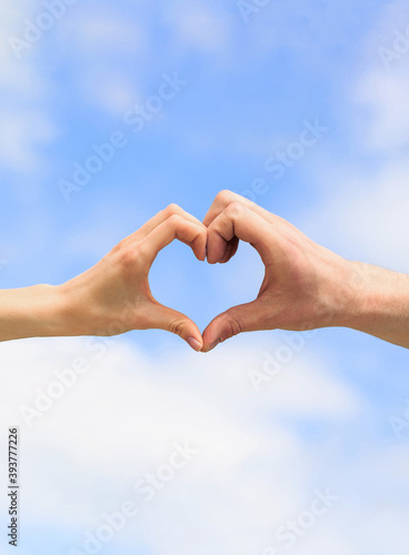 Female and man hands in the form of heart against the sky. Hands in shape of love heart. Heart from hands on a sky background