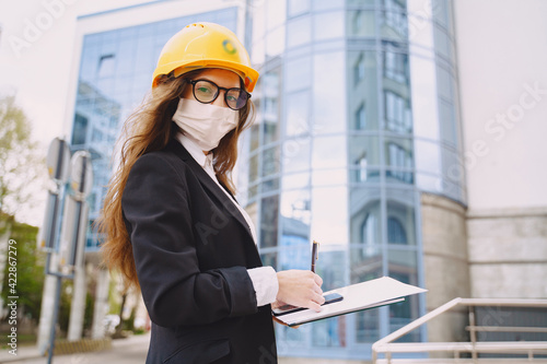 Female architect with construction site on the background