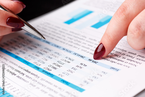 Female arm hold and point silver pen in financial graph
