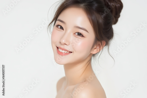 Female Asian Model with Short Hair - Young Beautiful Woman with Hair Bun - Studio Portrait of Asian Beauty for Fashion, Cosmetic, Skincare - Posing on White Background - Smooth Tied Hair