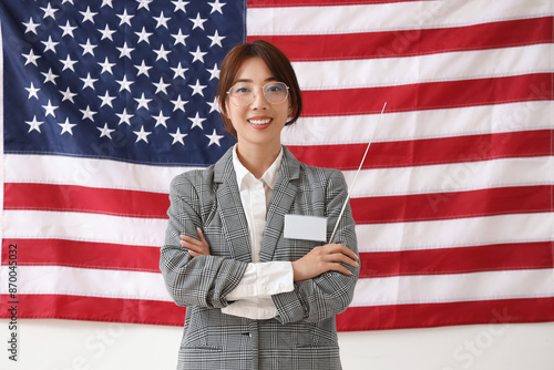 Female Asian teacher with pointer against USA flag. Labour Day celebration