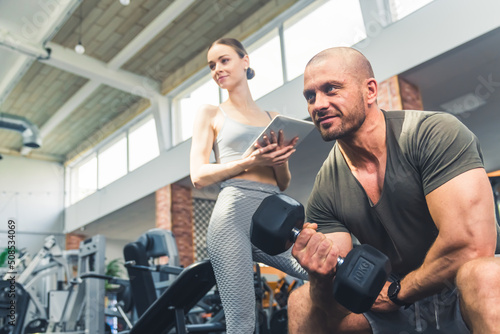 Female attractive slim personal trainer coordinating a weight training of a middle-aged bald strong guy lifting a 10 kilograms dumbbell. High quality photo
