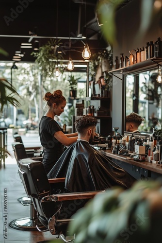 Female barber cutting a customer's hair in a modern barbershop. The stylish interior and grooming tools are visible