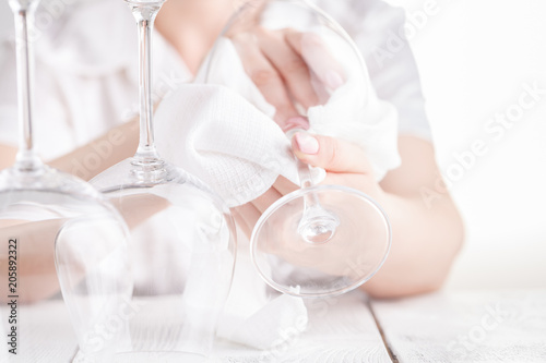 Female bartender wipes the wine glasses. The waiter wipes the wine glasses. Focus on the wine glasses. The concept of service