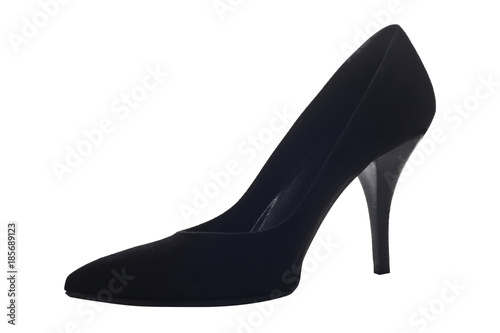 Female black leather suede high-heeled shoes isolated on white background, woman's footwear.