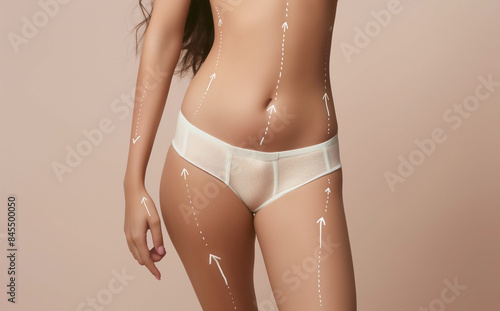 Female body on a light background with white medical marks, arrows for plastic surgery or liposuction, plastic surgery. fight against cellulite.