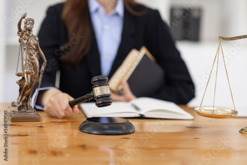 female business woman lawyers working at the law firms. Judge gavel with scales of justice. Legal law, lawyer, documents, advice and justice concept.