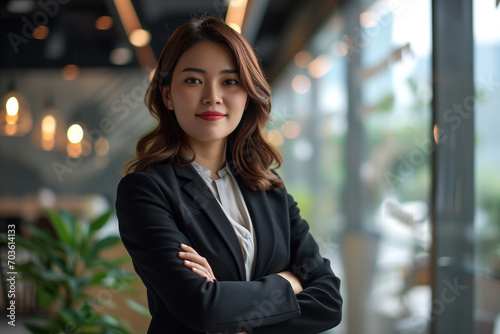 Female Businesswoman in Black Suit Greeting Visitors in Corporate Workplace