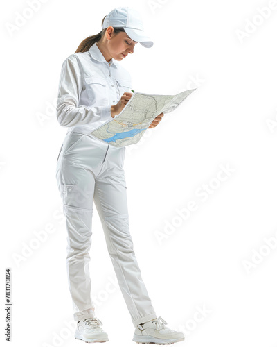 Female Caddie Analyzing Golf Course Map with Concentration, Representing Strategic Planning in Sports.