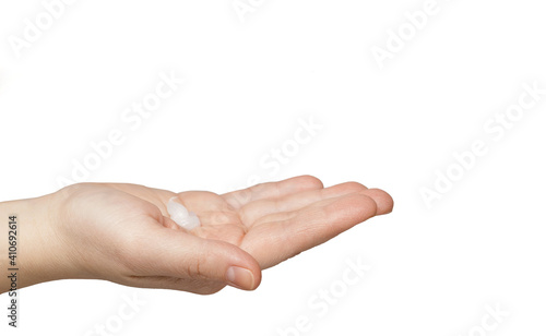 Female caucasian hand slightly bent palm with cream isolated on white background. isolate. health and beauty concept
