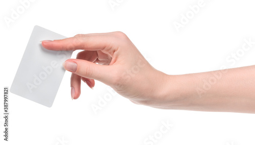 Female caucasian hands with blank business card isolated on white background. blank for designers
