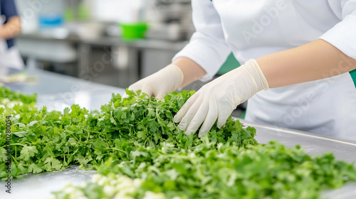 Female chef wearing apron doing quality check of cilantro standing in studio kitchen