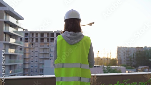 Female construction engineer is taking notes and writing on a clipboard while inspecting a construction site in the early morning at sunrise, back view