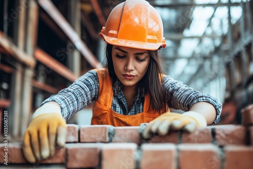 Female construction worker, brick laying, close-up in safety gear, industrial background, labor, hard hat, gloves, hard working woman at job site concept