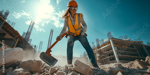 Female Construction Worker Shoveling Rubble, Woman in Safety Gear at Building Site, Construction Work in Action