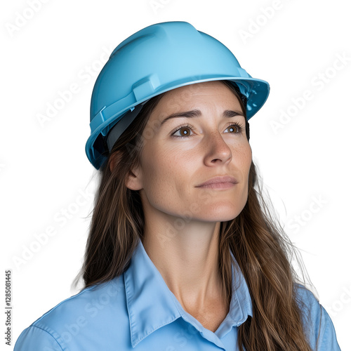 Female construction worker wearing a blue hard hat with transparent background