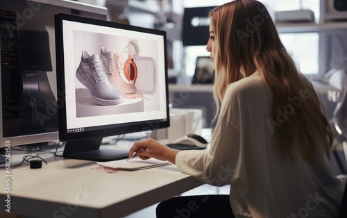 Female designer creating a shoe model while working on a computer