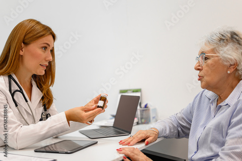 Female doctor explaining prescription while giving medicines to senior woman in clinic during consultation