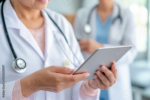 Female doctor in a white coat using a digital tablet in a medical environment, with another healthcare professional in the background, cropped