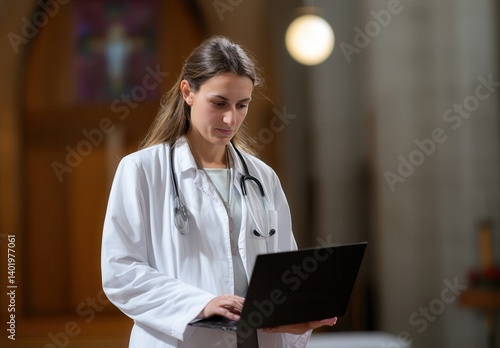 Female doctor in a white coat using a laptop in a medical setting.
